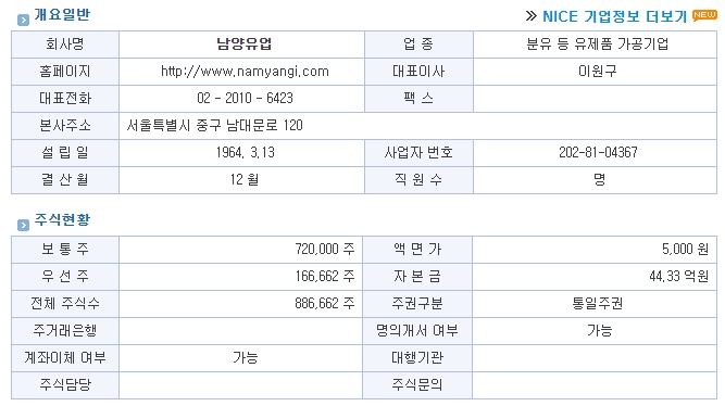 남양유업은 1964년에 설립된 분유, 시유, 발효유, 치즈 등 유가공제품 및 커피믹스, 음료제품 등을 생산 및 판매하는 회사로 대표적으로 불가리스, 맛있는우유 GT, 몸이가벼워지는시간 17차, 드빈치치즈 등이 있습니다.