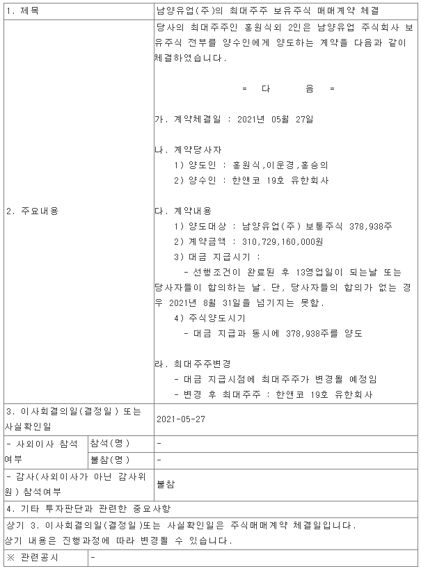 남양유업은 지난 5월 27일 홍원식, 이운경, 홍승의 지분 378,938주를 계약금액 310,729,160,000원에 한앤코 19호 유한회사로 매각 하였습니다.