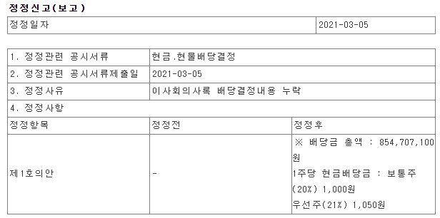 남양유업의 실적은 좋지 못하였으나 매년 주당 1,000원 배당을 실시하였고 2020년 역시 배당금 보통주 1주당 1,000원 우선주 1,050원으로 책정되어서 현금배당되었습니다.