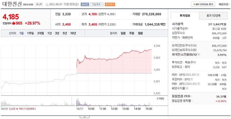 2021.06.07 - [강세업종] 전기장비 관련주 상승세 대한전선 22%