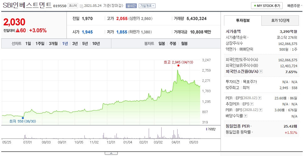 SBI인베스트먼트는 중소창업기업의 대한 지원을 진행하는 업체로 창업투자 조합도 결성되어 있습니다. SBI인베스트먼트는 야놀자 시리즈B, 시리즈C 를 통해 약 160억원을 투자하여 야놀자 관련주로 보고 있습니다. 주가 역시 꾸준한 상승을 하고 있어서 많은 사람들에게 관심을 끌고 있는 종목입니다.