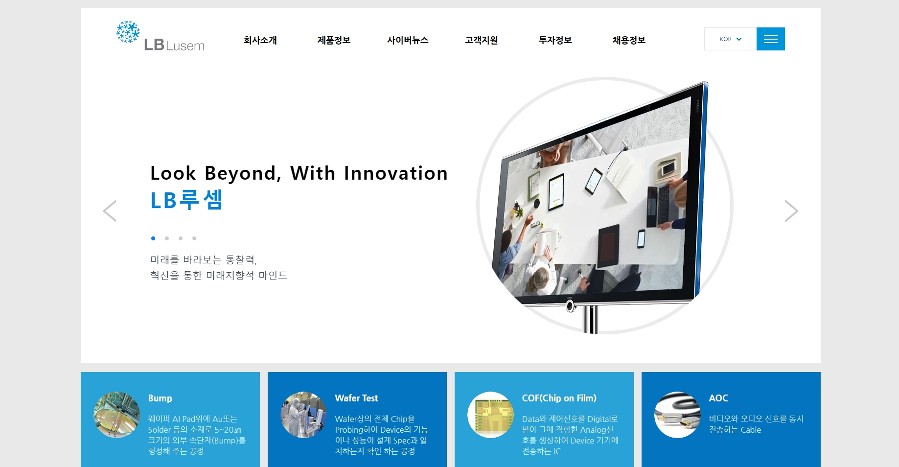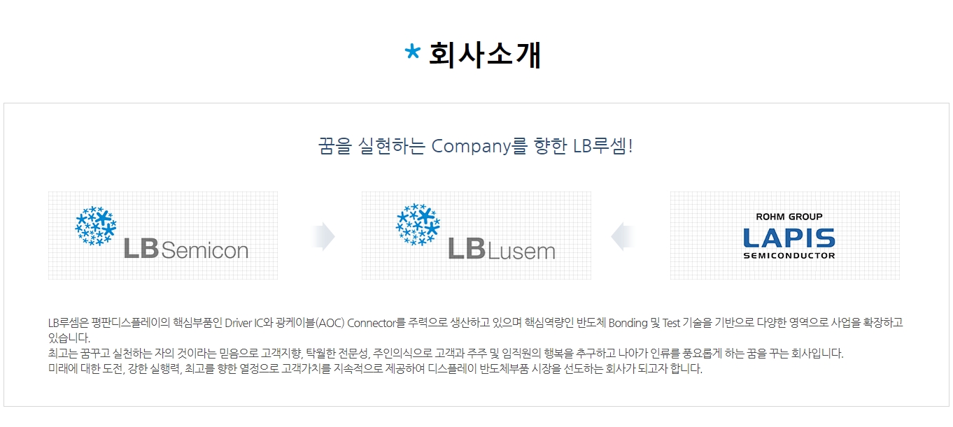 엘비루셈은 범핑, 패키징 및 테스트를 주력사업으로 하는 반도체 후공정 업체 입니다. 주 거래처는 LG계열사인 실리콘웍스로 2018년 매출 약 8,000억으로 전세계 팹리스 기업 중에 매출규모 19위에 랭크되었으며, 2020년은 매출 1조원을 넘어서며 국내 대표 팹리스 업체로 성장했습니다. 엘비루셈은 고객사인 팹리스의 요청에 따른 사양과 개발일정에 맞춰 팹리스에서 설계한 주문형 반도체에 대한 범핑, 패키징 및 테스트 수탁 임가공 서비스를 전문으로 하는 후공정 회사 입니다.