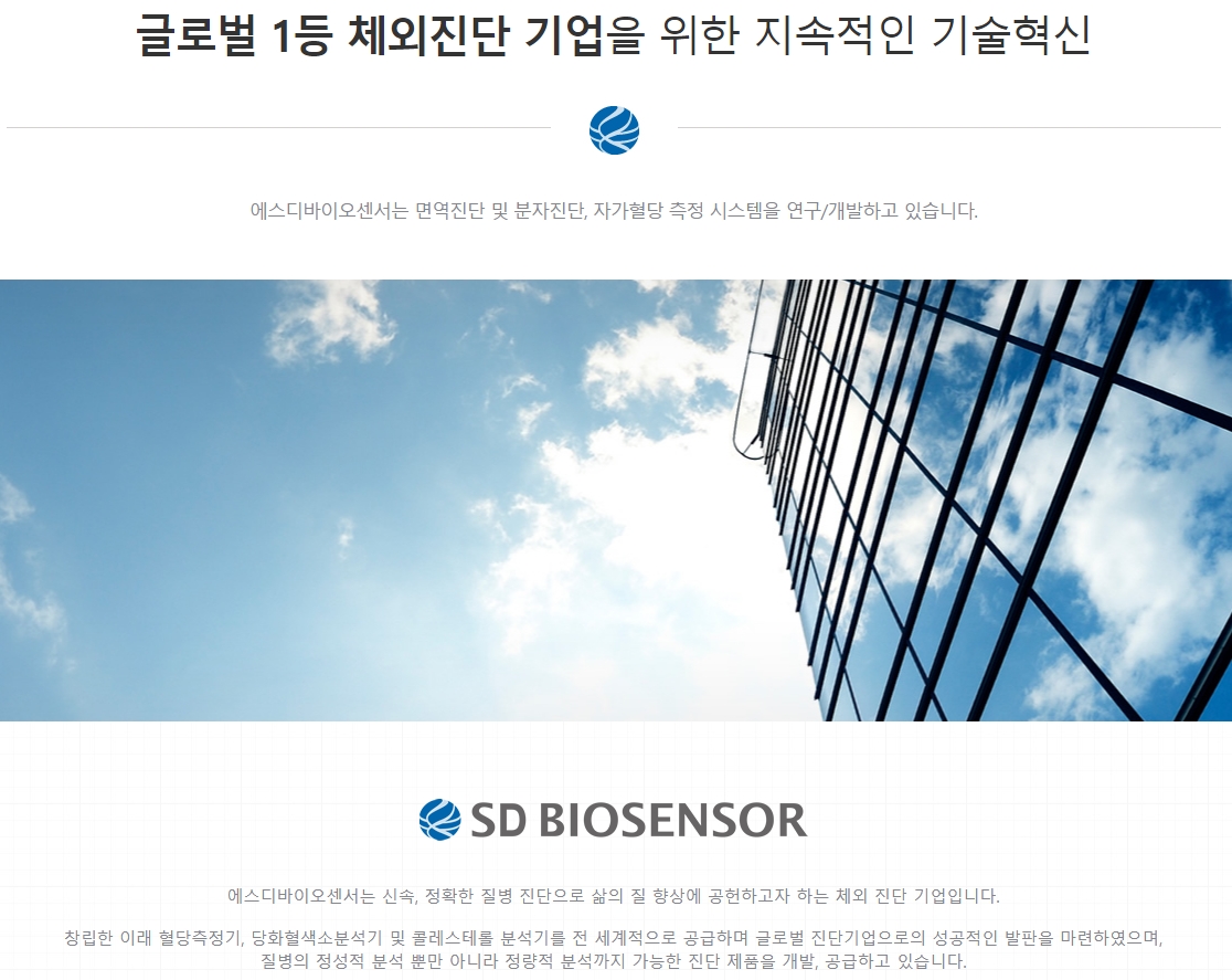 에스디바이오센서는 의료용 기기제조업을 영위하는 기업으로 2010년 12월 27일에 주식회사 에스디(현 한국애보트진단)에서 바이오센서 사업부문을 인적분할하여 설립 하였습니다. 기존에는 당뇨병 환자를 위한 혈당 측정기계를 만들었는데 코로나 19 바이러스를 집에서 쉽게 진단할수 있는 진단키트를 개발하여 식약처 조건부 허가를 받았는데요 검사 받으러 가는것 조차 어려운 것을 집에서 쉽게 해결할수 있게 되어서 많은 사람들에게 좋은 호응을 얻고 있습니다.